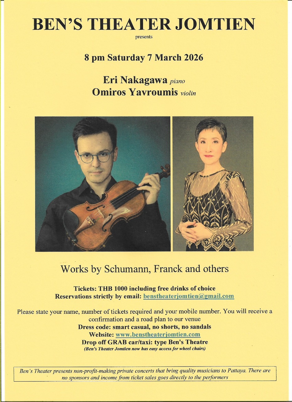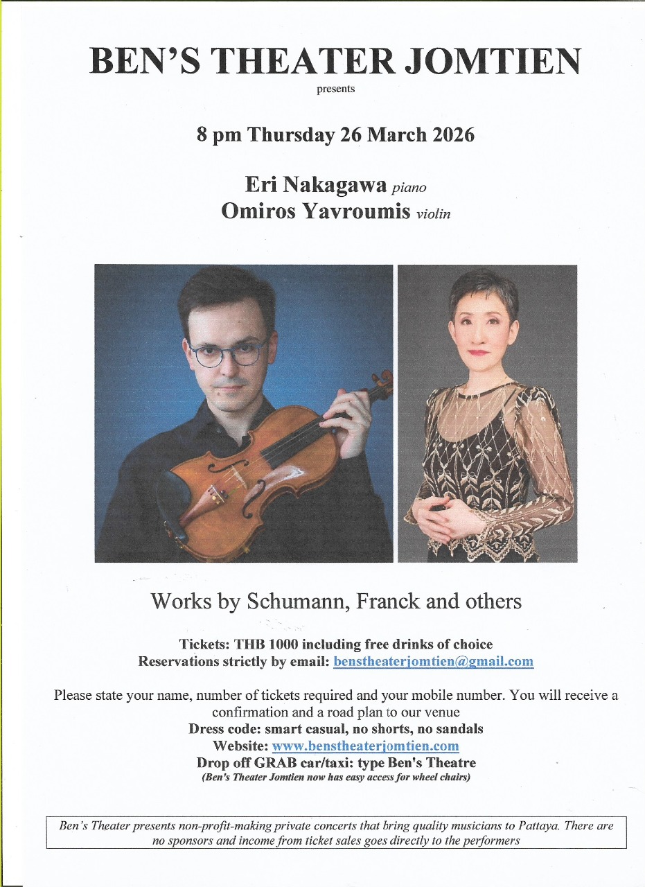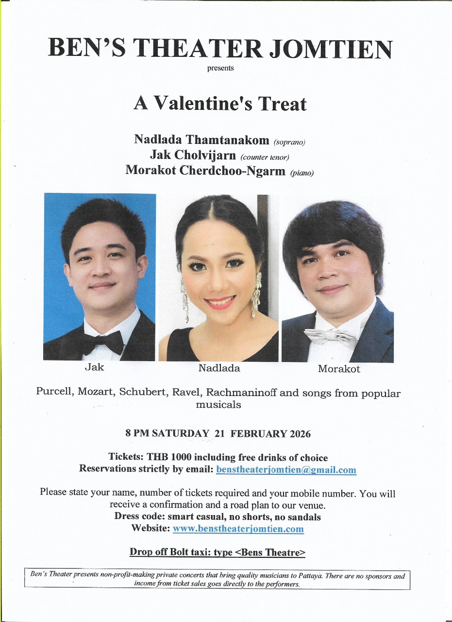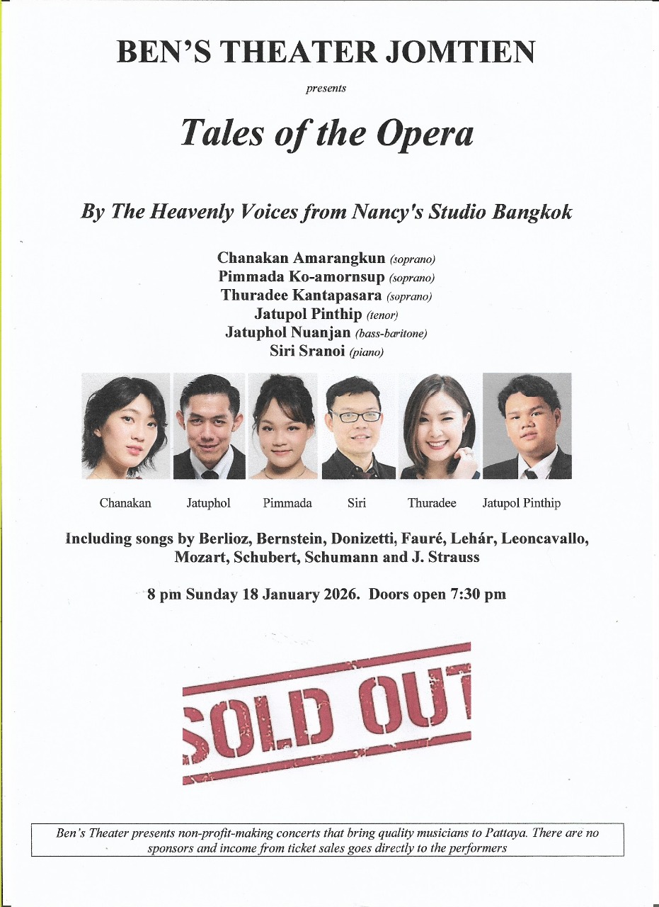 From March 24 till 1 November 2025 Ben's Theater Jomtien has no planned concerts due to Songkran and the hot weather.