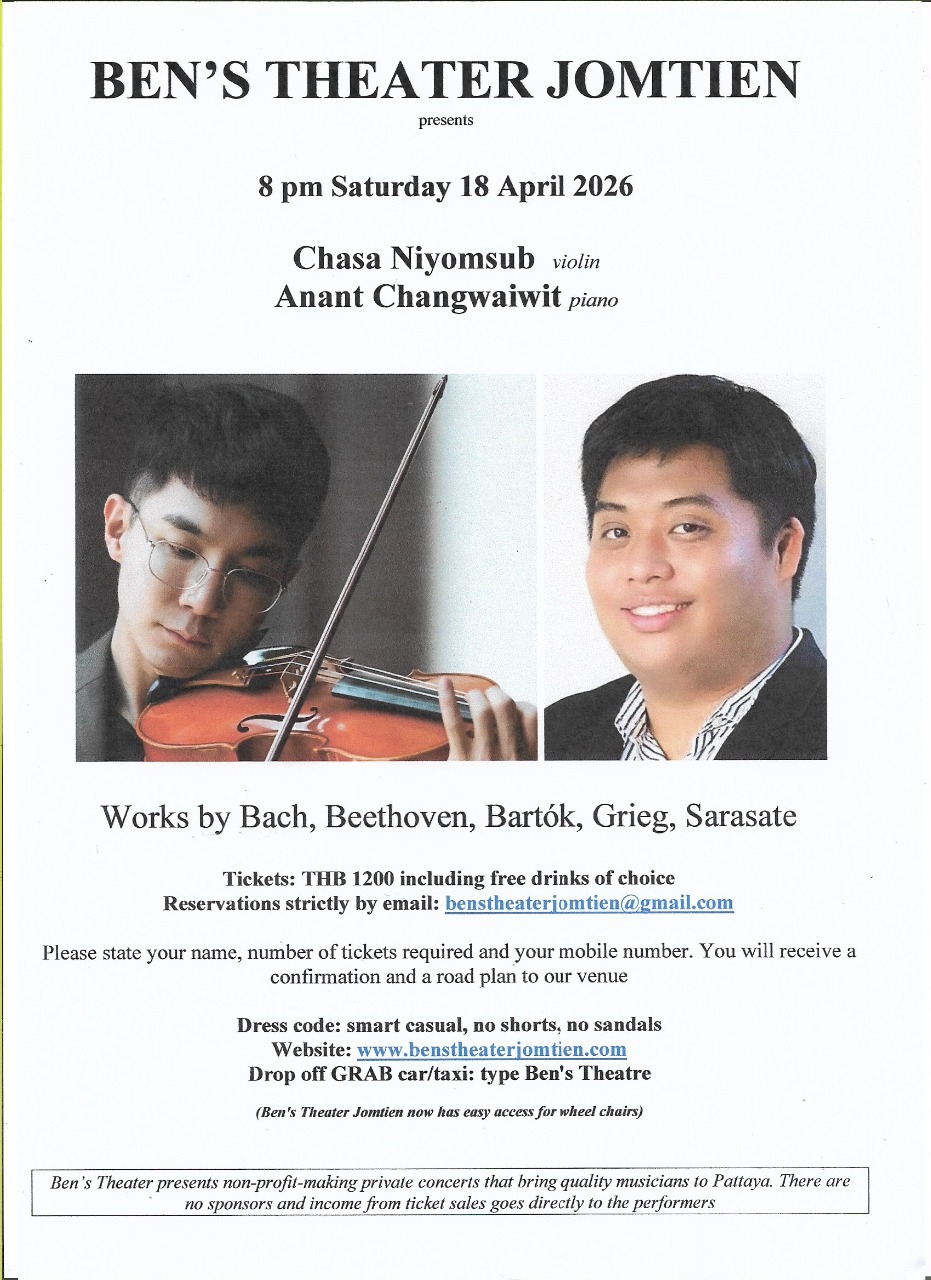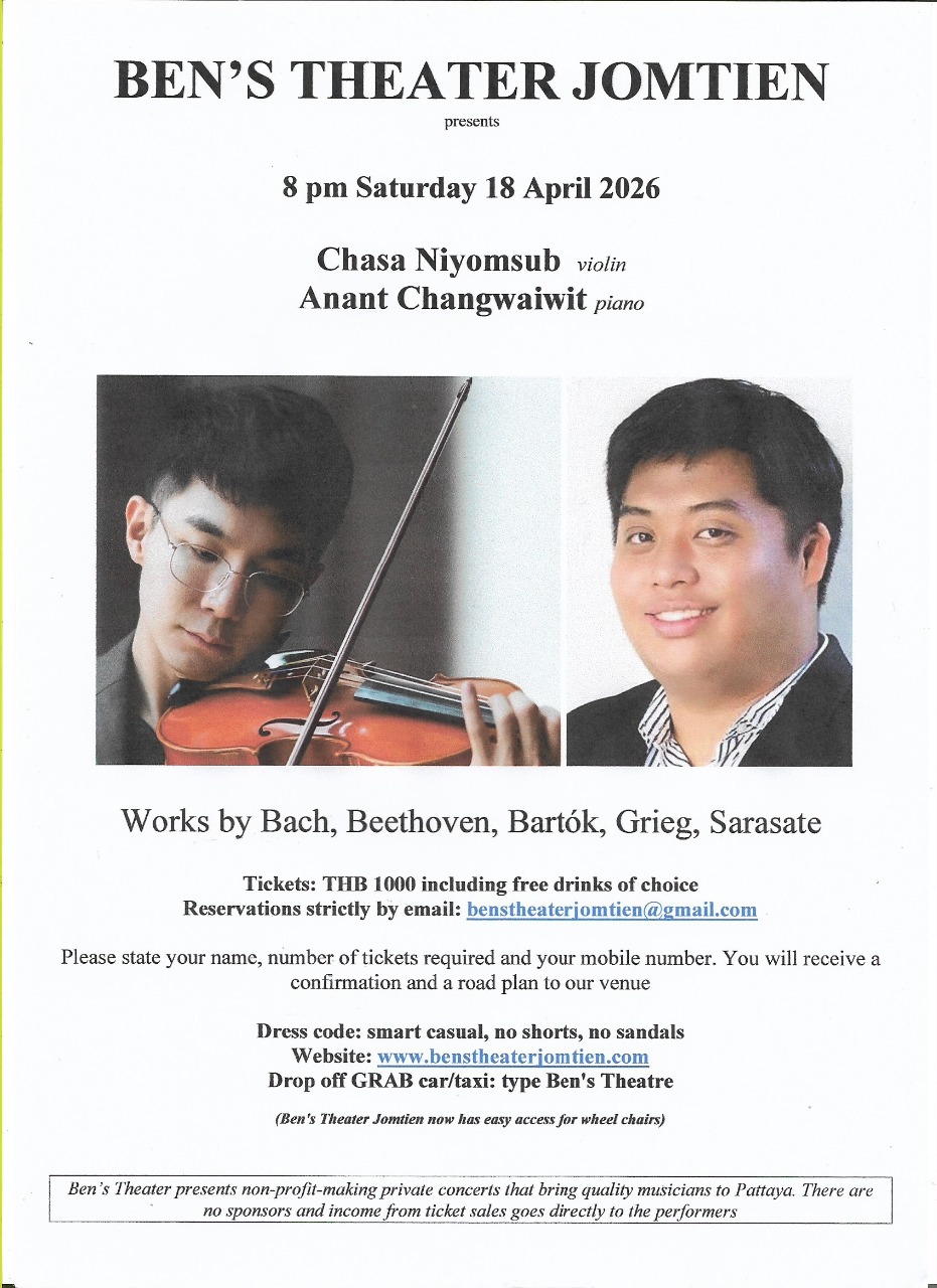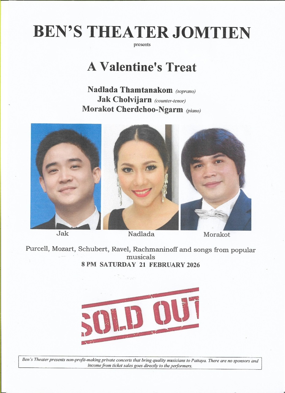 From March 31 till 1 November 2026 Ben's Theater Jomtien has no planned concerts due to Songkran, the hot weather and the rainy season.