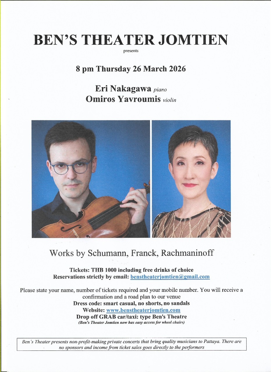 Aan het einde van een rustig straatje in Jomtien staat een bescheiden villa die eens per maand verandert in Thailands meest intieme concertzaal. Met een capaciteit van slechts 50 zitplaatsen is Ben's Theatre het geniale idee van Ben Hansen, een gepensioneerde Nederlandse fotojournalist die cultureel gastheer werd en zijn muziekpodium nu runt als een liefdadigheidsproject. Bijna per ongeluk opgericht in 2004, rolt Hansen in het hoogseizoen een kleine rode loper uit om een eclectische mix van nationaliteiten in zijn huiskamer te verwelkomen, allen verbonden door hun gedeelde liefde voor klassieke muziek.