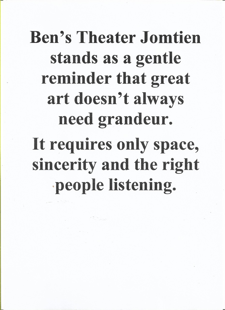 Ben’s Theater Jomtien is een prive initiatief voortgekomen uit liefde voor muziek en musiceren. Het is een non-profit eenmans organisatie dat naast de reeds genoemde doelen ook een podium biedt voor jonge muziekstudenten en amateurs om ervaring op te doen bij optredens voor een aandachtig en dankbaar publiek.