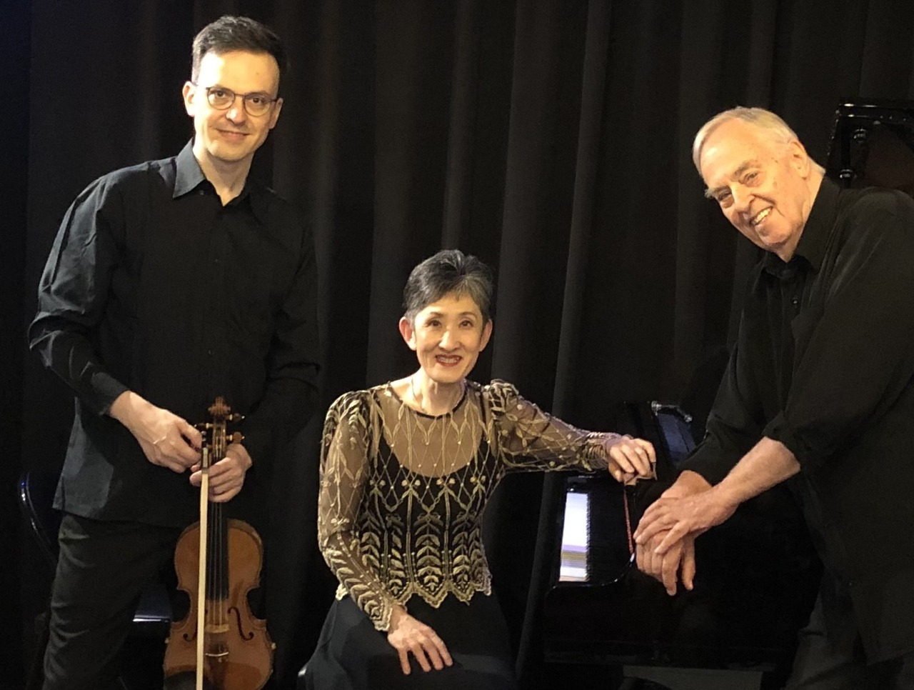 Omiros and Eri didn’t have this challenge, but I noticed that the lid of the Yamaha piano had been partially closed, producing a more satisfying instrumental balance. The Franck sonata begins with a lilting melody from the violin played expressively by Omiros and a chordal accompaniment played with sensitivity by Eri. This melody forms the basis of the entire movement and Eri performed the virtuosic and rhapsodic piano part with confident aplomb. The movement displayed excellent ensemble playing with some remarkably beautiful moments.